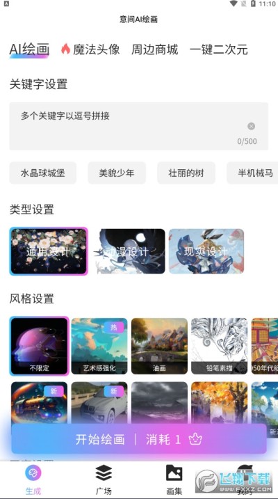 AI意间绘画生成软件是一款艺术创作的绘画软件,这款绘画软件的功能丰富,玩家可以进行ai绘制,通过输入不同的关键字来进行画作的生成,用户可以发现喜欢的作品,创作精彩作品,还可以享受到ai绘制的乐趣,感兴趣的赶紧下载体验吧!