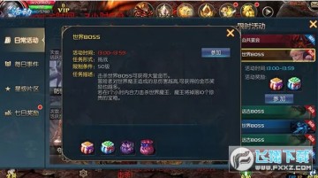 等级达50级的神选者,可在每日的13:00-13:59或21:00-21:59时,进入【活动】界面,在【限时活动】中找寻到【世界BOSS】,即可前往挑战火焰锤炼者·菲拉斯或荒野掌控者·卡萨斯。