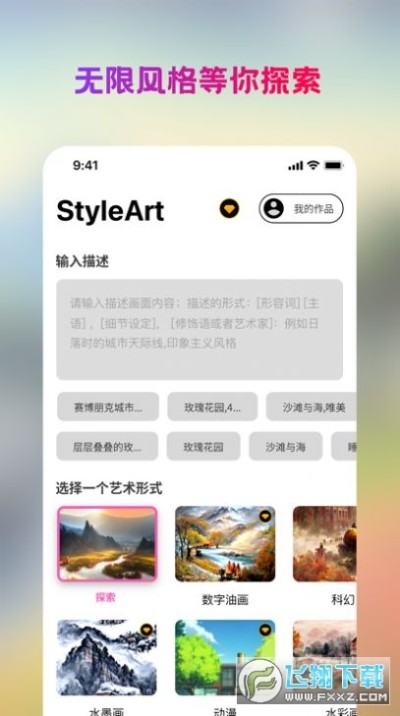 styleart AI绘画头像制作是一款ai智能绘画服务软件,只需输入关键词,就可以开始创作各种艺术作品,表达自己此时此刻的想法,清晰地为您呈现作品,定制图片大小设置,新手也可在线操作,感受有趣的绘画过程,随时在线创作作品。