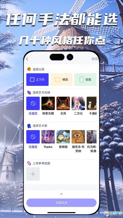 描述你天马行空的灵感,即可创作,满足你多样的艺术创作需求,您可专心沉浸自己的画世界,精彩创艺,随时随地!