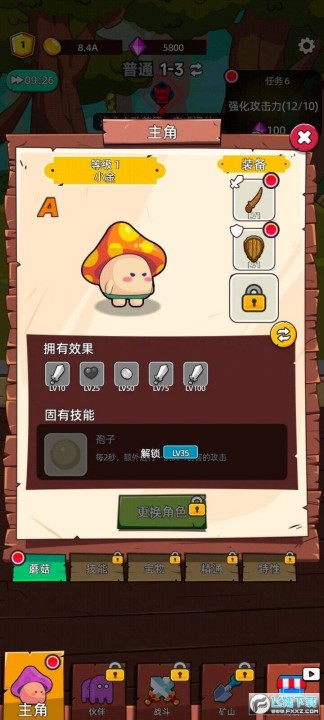 蘑菇的挑战,磨叽蘑菇是一款可爱风格的放置挑战游戏。在游戏中,玩家放置一个蘑菇开始各种冒险挑战。磨叽蘑菇里面有许多关卡挑战,一开始都是小怪,到了最后还有一个boss。你有信心能顺利通过吗?