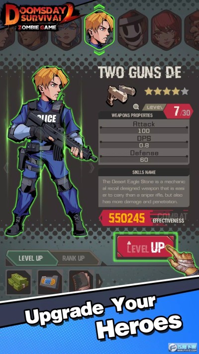 2、可以招募新的幸存者英雄,进行升级,提升等级和能力,打造终极僵尸杀手团队;