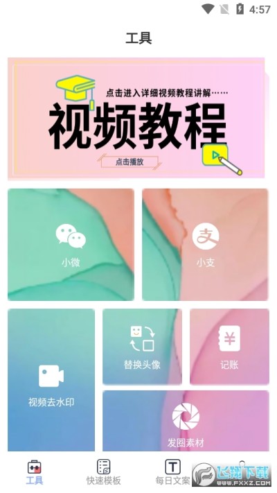 在快速模板中,用户可以进行微信等模板的素材制作,并可以长按进行图片的更换,还可以进行文本等内容的分享。
