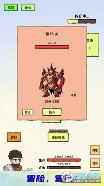 勇者挖金矿是款休闲冒险游戏,玩家在游戏中需要帮助角色完成很多的战斗,但是关卡中遇到的敌人攻击力会不断提高,为了能够完成关卡的战斗角色的战斗力也是需要提升的,快点下载游戏吧!