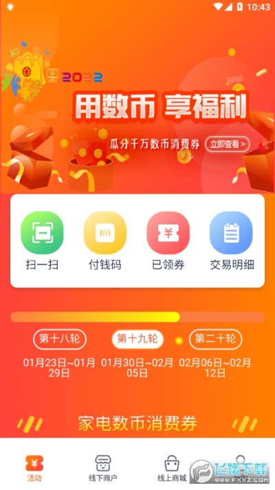 1、根据规则领取家电、家具、商超、餐饮四大场景的数字人民币满减消费券;