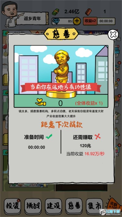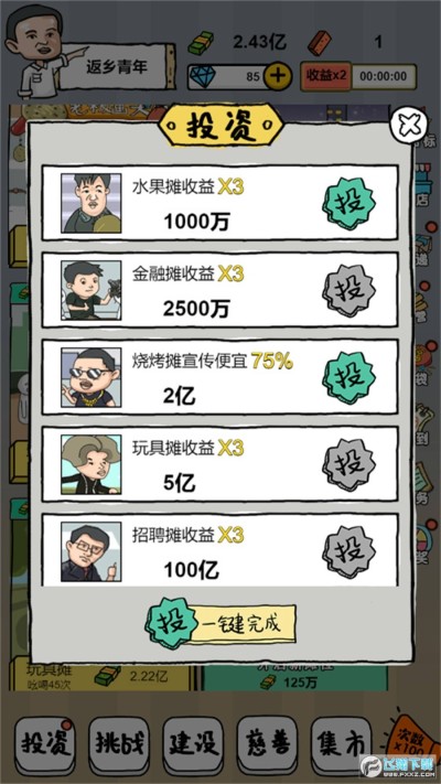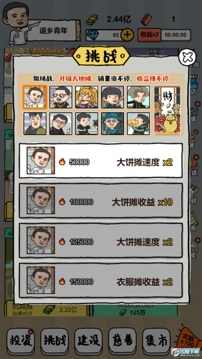 摆地摊模拟器无限钻石免广告版是一款卡通风格的放置模拟经营类手游,玩家可以在游戏里的街头摆地摊赚钱,选择经营不同的摊位获取相应的收益,收集各种魔性恶搞的知名人物,根据人物在不同的摊位获取更快的赚钱效率,投资更多的项目赚取钞票,轻松放置挂机享受赚钱创业的乐趣!