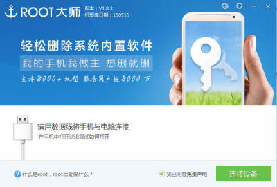 只需连接手机到电脑端,点击一键ROOT即可。不需要其他操作。ROOT成功之后软件会有提示,同时手机里会自动生成授权管理软件。有了授权管理,就可以非常自由的进行禁止程序后台启动,开机启动,删除系统内置软件等操作了。