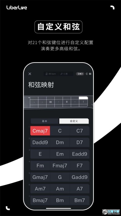想要尝试更多的高级和弦?你可以通过对21个和弦键位进行自定义配置,实现maj7、m7、add9等更多和弦变化。