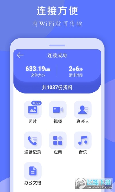 可实现通讯录、图片、视频、影片、音乐、电子书、PDF文件、Apk安装包等多种类型的数据互传。