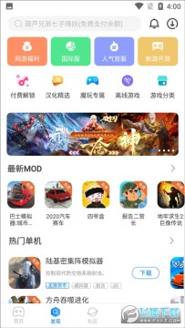 2、在发现里,你可以根据游戏类型找到你要玩的游戏,拥有最新mod、热门单机、主机云游戏、国际版专区、变态版精品等等众多的类型可以选择