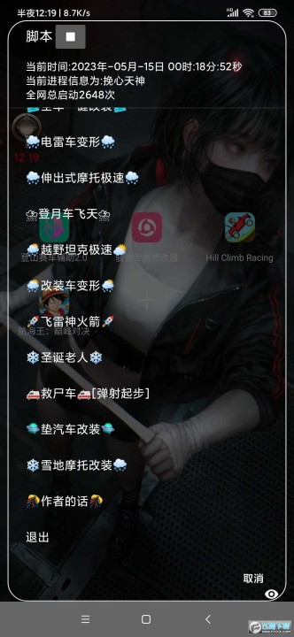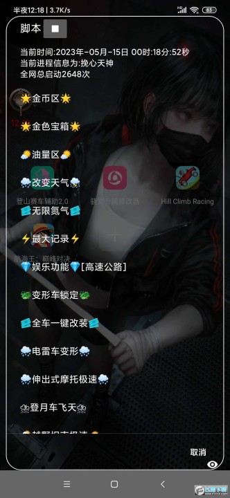 登山赛车gg修改器脚本2.0最新版是一款登山赛车的多功能修改器脚本,脚本里有32项脚本功能可以自由的选择,软件可以通过悬浮框开启,自由的获取无限的金币宝箱和油量等属性,在游戏里还可以自由的变形飞天获取更高的成绩,轻松选择自由的修改,喜欢的小伙伴快来下载吧!
