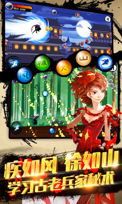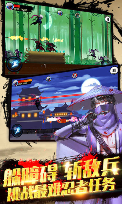 游戏中玩家可以选择“剑客、忍者、弓手、舞姬”等角色,翻越层层障碍,躲避各种机关陷阱,斩杀拦路而来、数量惊人的刺客和飞贼,最终可以挑战黑暗势力的BOSS。