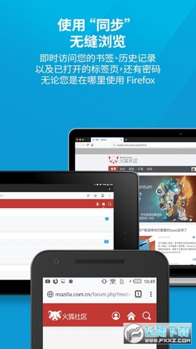 平板机版Firefox提供有与其他智能手机版本相同的浏览器基础功能,包括Mozilla的渲染引擎,Firefox同步将支持用户在桌面版浏览器与移动设备之间同步书签和其他数据,也支持安装使用最佳组件。