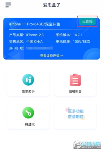 将安卓设备成功连接 iPhone 后,界面中会出现提示“已连接”提示,并显示设备机型、产品类型、系统版本、电池健康、序列号等信息。