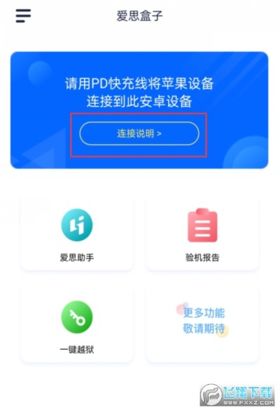 现在,您可以将安卓手机与苹果 iPhone 通过数据线连接,可以点击“爱思盒子”中的“连接说明”查看如何连接,或点此查看详细的连接教程。