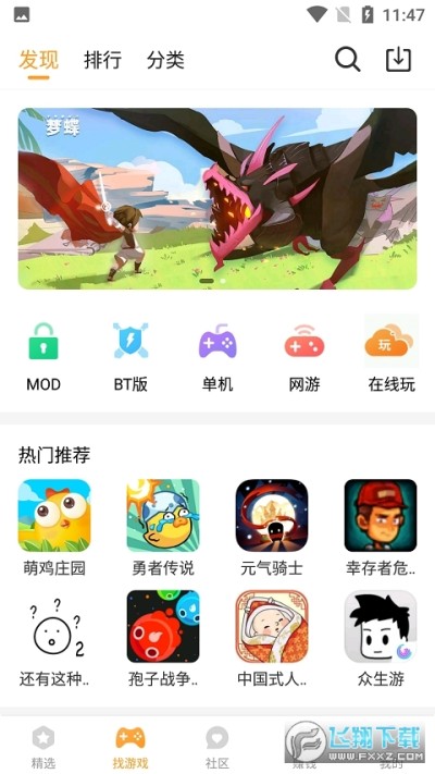 2、在“找游戏”界面,有MOD、BT版、在线玩、单机、网游及平台推荐的各种精品游戏;