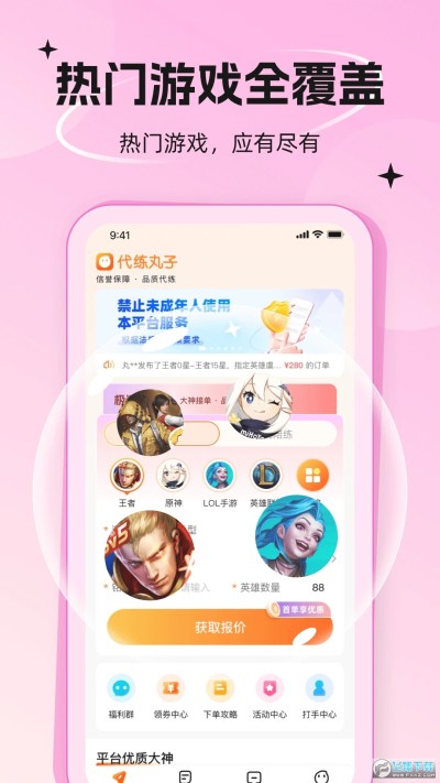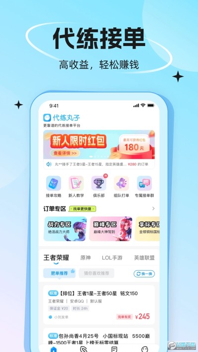 即刻下载代练丸子,开启你的找代练/做代练之旅。代练丸子是累计注册千万用户的游戏代练平台,专注为用户提供优质、高效、快捷、安全的游戏代练服务,您可以通过代练丸子找大神代练上分,也可以利用闲暇时间代练接单,轻松赚钱,涵盖游戏:包括但不限于王者荣耀、英雄联盟、英雄联盟手游、原神、和平精英、穿越火线:枪战王者、使命召唤、QQ飞车手游以及逆战等多款热门游戏。