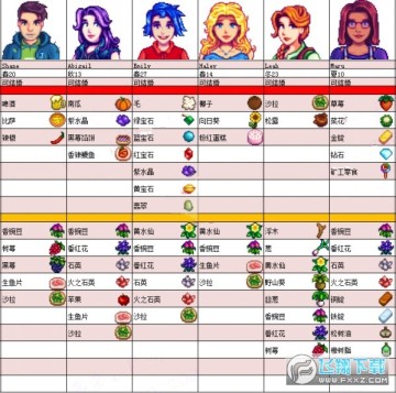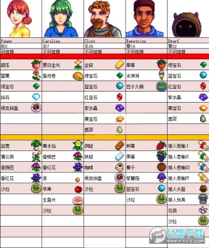 4、阿比盖尔:是一个叛逆性的女孩,最喜欢器材碎片、兔子的脚、黑莓馅饼、巧克力蛋糕、河豚、紫水晶、南瓜,喜欢所有宝石、料理、工业品、花、不喜欢所有的鱼、手工艺品、矿产、建筑材料等,讨厌所有的蛋、垃圾、鱼饵、牙签、海藻等。