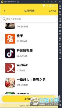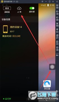 2、进入雷电云手机app——点击悬浮窗——点击左上角上传按钮。