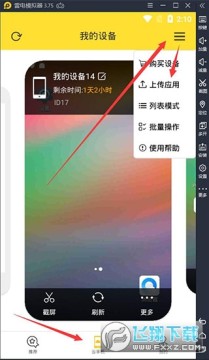 1、在本页面下载安装app,打开云手机后点击右上角菜单——上传应用。