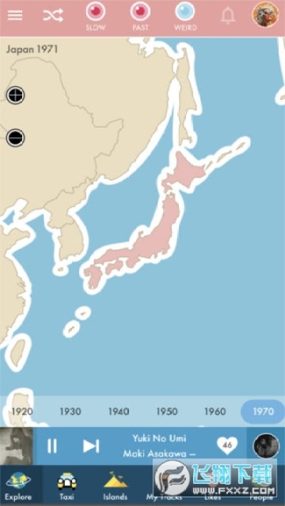 2、点击图标进入界面。当你在地图上看到土地时,你可以随意选择地区,也可以在下面点击时选择年龄。戴上耳机就能听到原始的古乐。
