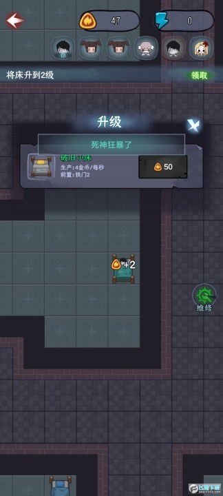 2.进入房间后直接上床,通过睡觉涨金币,建造装备,无论发生什么事千万不能下床,如果有怪人破门而入,也不要下床。