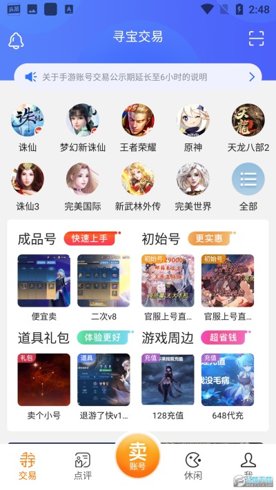 寻宝天行完美世界交易平台(寻宝网交易app)是一款官方正版打造的手游账号交易平台,用户可以搜索关键词查询自己心仪的账号,安全账号交易有保障,不用担心被盗,对软件感兴趣的话不妨点击下载试试!