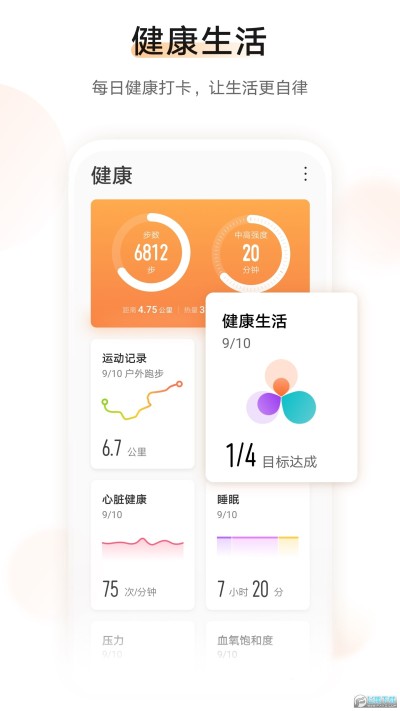 1、运动健康为华为手机用户提供24小时运动监测和健康服务。各种丰富的图表使用户可以清楚地查看运动和健康数据。