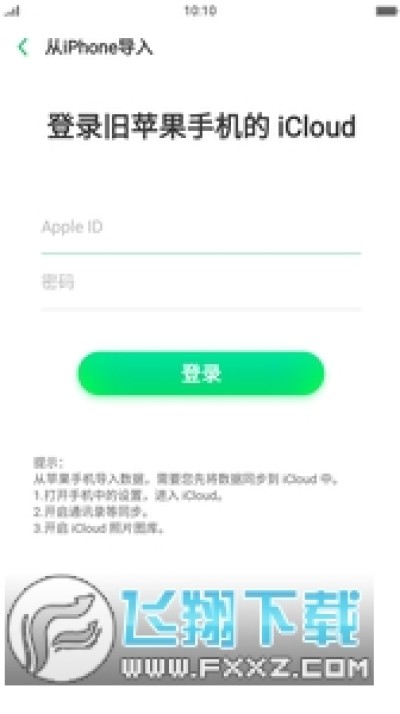 打开OPPO新手机的手机搬家应用,并选择"从iPhone导入"。输入苹果手机的iCloud账号和密码。