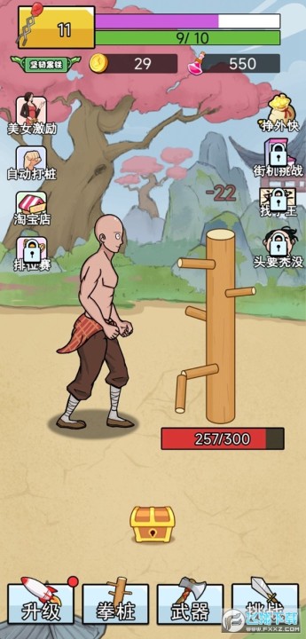 1.采用卡通艺术风格,无限制放置点击强化,玩家可通过攒钱购买武器或强化武器