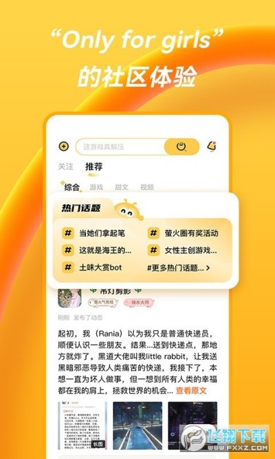 萤火圈app是一款专为女生打造的游戏社区交流平台,这里有众多喜欢玩游戏的女性玩家,你可以分享你游戏的精彩瞬间,还有各种游戏的测评和攻略。