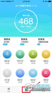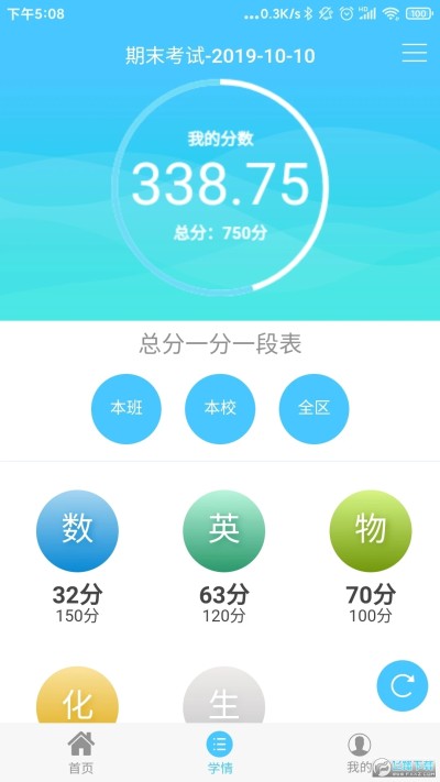 4、登录后,点击底部【学情】菜单,就可以查看到各科的成绩,示例如图。