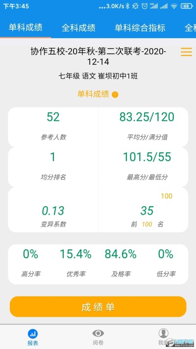 4、查看成绩、排名、学科均衡性、成绩对比、进退步、分段统计分析