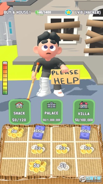 作为一个无家可归的乞丐,你可能很难让别人喜欢你,但你可以通过乞讨来的钱改变你的衣服和外衣来变得富有并被接受。求填饱肚子子,买房买车,尽情享受吧!当你求时,升级并更有效率地求!