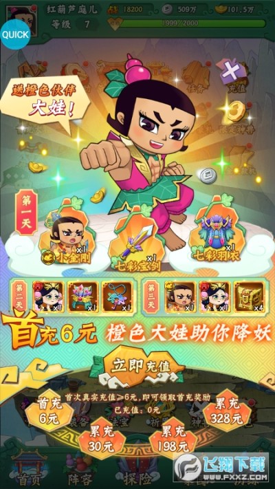 葫芦兄弟七子降妖高倍代金返利版BT版最新版是一款以葫芦兄弟为题材的策略卡牌类手游,游戏还原了动漫里的故事情节和角色,玩家可以收集各种葫芦兄弟搭配自己的阵容,上线获取代金提款金获取十亿元宝,做任务提取代金券免费支付提现,领取vip30给大家最好的游戏体验!