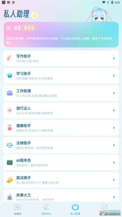 毒霸姬手机桌宠安卓版是一款以人工智能AI的Q版卡通软件,软件里用户们可以和可爱的毒霸姬互动,根据自己的需求来提问并获取智能AI的回答,还有丰富的编辑功能根据需求一键生成高质量的原创内容,做出自己的私人助理更好的处理自己的事务,想要尝试这款AI的小伙伴不要错过!