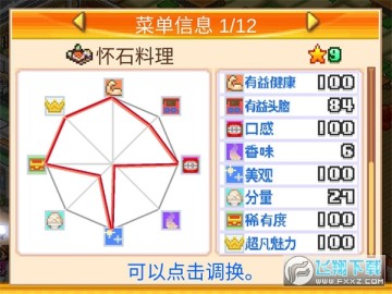 2、每一种料理都有一个有益健康、有益头脑、口感、香味、美观、分量、稀有度、超凡魅力的数值,以上八个数值在下文统称为八维。从料理开发进去,在菜品的八维图中我们也能直观地体验到。