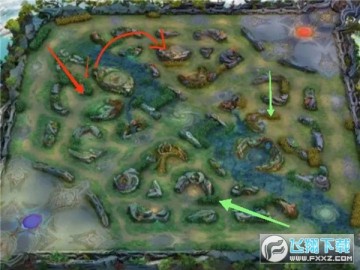 敌方打野前期弱势或者敌方阵容前期偏弱无控制。先打掉自家弹簧花跳到敌方红区(红色箭头位置),记得发信号给中路,防止被反抓了