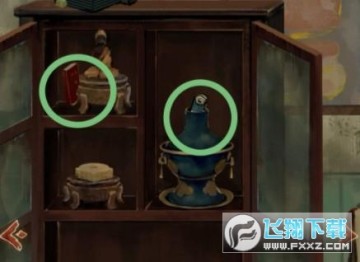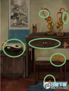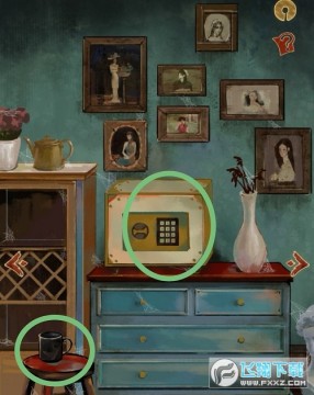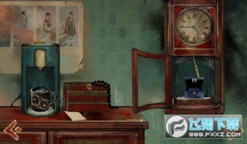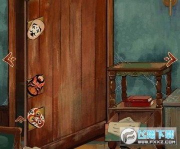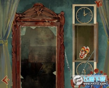 将桌子上的烟灰缸砸向有三个钥匙门旁边的黑罐子,得到第二个脸谱钥匙;将得到的纯黑色马克杯放在接水器的下面,杯上产生图案,根据图案调节钟表的位置,得到第三个钥匙