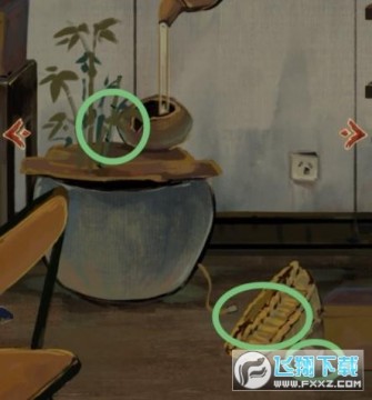 12.将竹竿与蓝绳子组合,又与篮子组合,得到一个捕捉动物的陷阱,将陷阱放在鼠洞旁边,将剥好的香肠放上,诱骗老鼠将带变压器的鼠笼插入插座,并将老鼠放入将从画报上获取的胶带缠到松动的电线上。