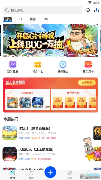 巴兔游戏盒子正版最新版是一款非常实用的手机游戏盒子平台,在这里为用户提供海量的游戏资源,我们打开游戏就有满级的vip,还有各种元宝钻石,这里每天都有大量的游戏上线,热门精品通通第一时间发布,这里不仅仅有bt游戏,更有h5,折扣游戏等你来玩。