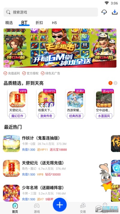 主要涵盖各类型bt游戏,从新游预告到新游首发,众多精品手游以供玩家选择,包括人气手游推荐,新手福利会员福利等等,从画面品质到动作效果都深受玩家喜爱。