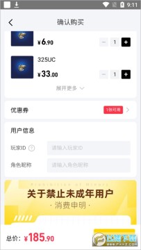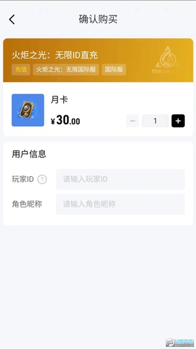 5、然后输入好玩家id和角色昵称,确认下信息,以及使用优惠券的信息后点击【确认购买】