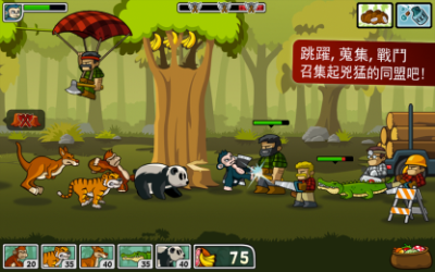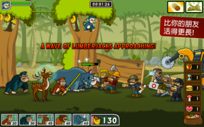 猴子抗强拆是一款卡通画面的休闲益智手游,游戏中玩家需要帮助猴子们来对抗可恶的砍树人,保卫自己的森林野生家园,游戏中不同的动物都拥有自己的特殊能力,玩家需要做的就是合理安排队伍的动物种类,让它们进行有效的进攻。