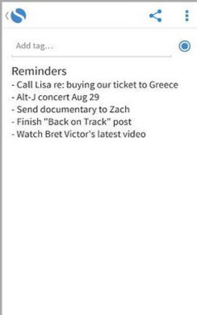 当你想到要记的事情时,只要打开Simplenote,点击画面右上角的“+”号,然后写下来就行了。写完以后,你可以为这则笔记加上TAG标签,或是点击记录框右上角的圆圈,为它做重要标记。