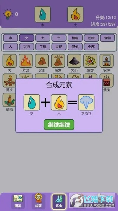 《简单的炼金术》是一款合成类游戏。在游戏中您将扮演炼金术士,通过对四种基本元素进行炼金,从零开始创造宇宙中的森罗万象。您所需要的,只是一颗不断探索世界的好奇心。本游戏采用了两两合成的游戏玩法,游戏最初只有“土”“水”“空气”“火”四种基本元素,组合这些元素并创建新的元素。不断混合和开放元素,创造更多元素。运用逻辑和想象力,有些反应相当艰难。为惊喜做好准备!