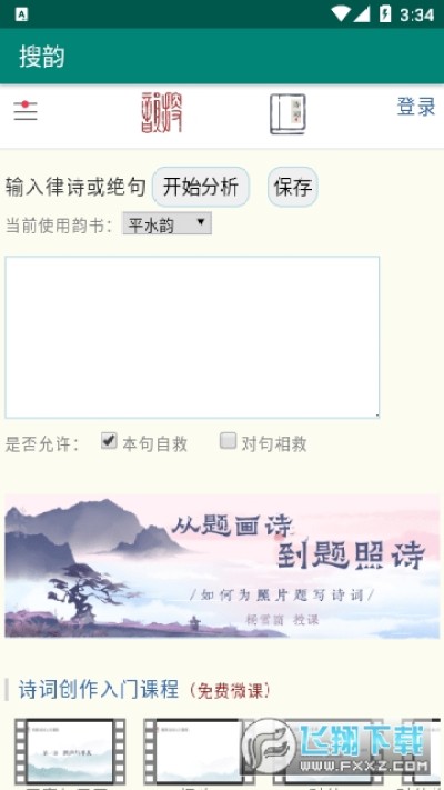 律诗校验搜韵软件手机版是一款可以在线搜索诗词韵律的工具,使用本软件输入律诗或者绝句,点击分析即可为你检测当前所使用的韵书类型,操作简单易上手,超多优质韵律文章等你阅读,对软件感兴趣的话不妨点击下载试试!