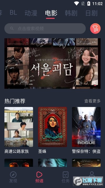 1、在“频道”页面的搜索框中,搜索自己想看的剧或者电影、综艺