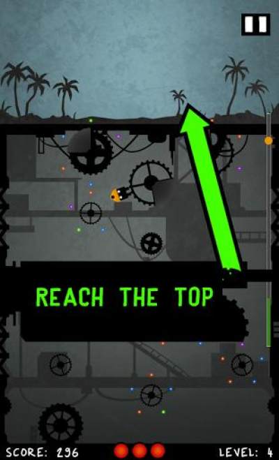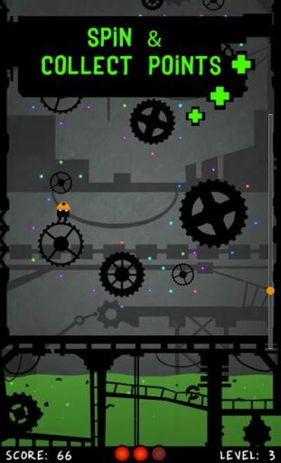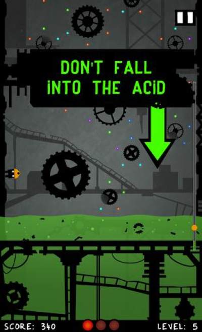 点击屏幕,让矿工从一个齿轮跳到另一个齿轮并收集齿轮周围的点,同时保持不要落入硫酸中。当完全收集发黄光的点时能够暂时停止硫酸上升。尽量不要打屏蔽的区域,否则你会被反射回来!