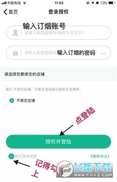 第四步:输入新商盟账号和订烟密码。记得要勾选“我已读并同意”,同时最好也绑定好店铺。